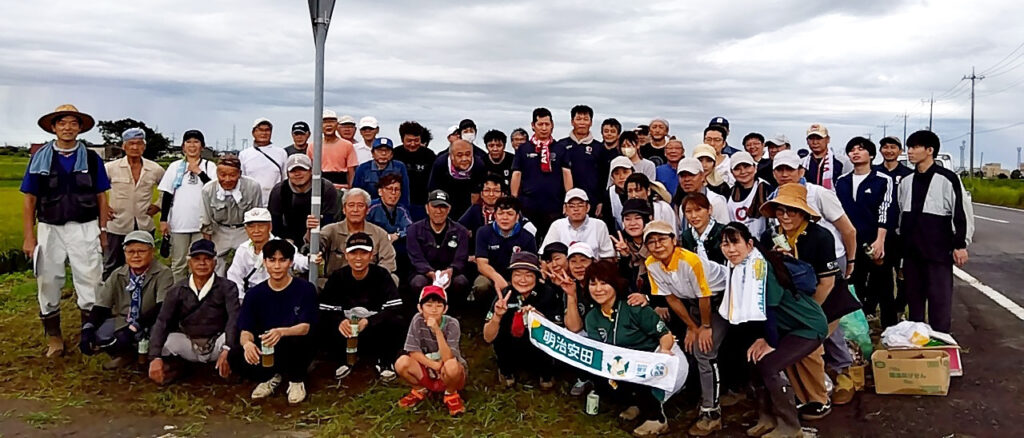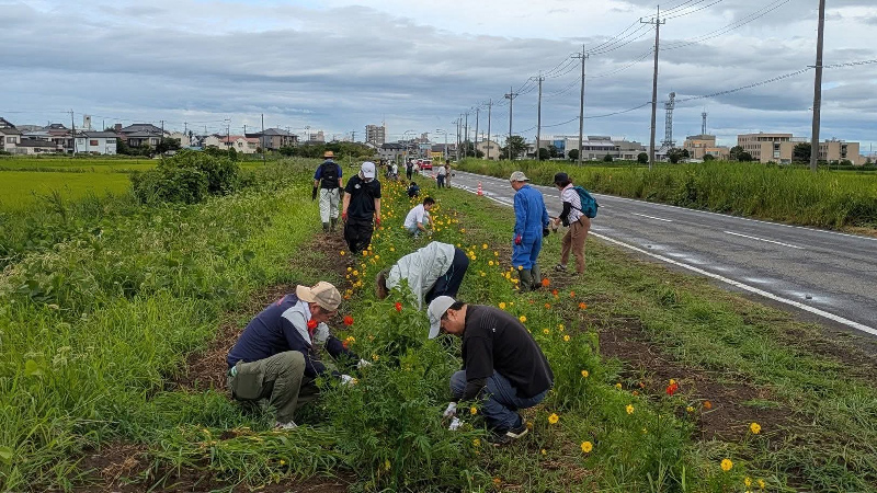 龍ケ崎市佐貫停車場線(馴柴地区寄り)の除草作業に5事業所から45名のご協力をいただきました。午前6時30分から約2時間の除草作業により雑草がきれいになくなり、開花し始めているコスモスの景観が美しくなりました。今回は台風明けでの曇り空で気候的には快適でしたが、雨上がりで足元がぬかるんでいる状況であったのが大変でした。皆様のご協力、ありがとうございました。