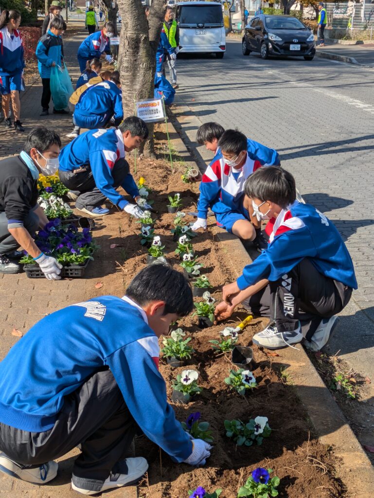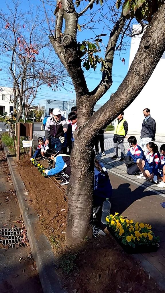 秋晴れの下、城ノ内中学校から25名のご協力をいただき、さんさん館前の通りに三色のパンジーの花植えを行いました。作業前に植え込み周辺の落ち葉清掃を行い、花植えの仕方を説明してからパンジーの花苗を次々と植えつけてもらいました。1時間半で美しい花通りが姿を現しました。 城ノ内中の皆さん、ご協力、ありがとうございました。