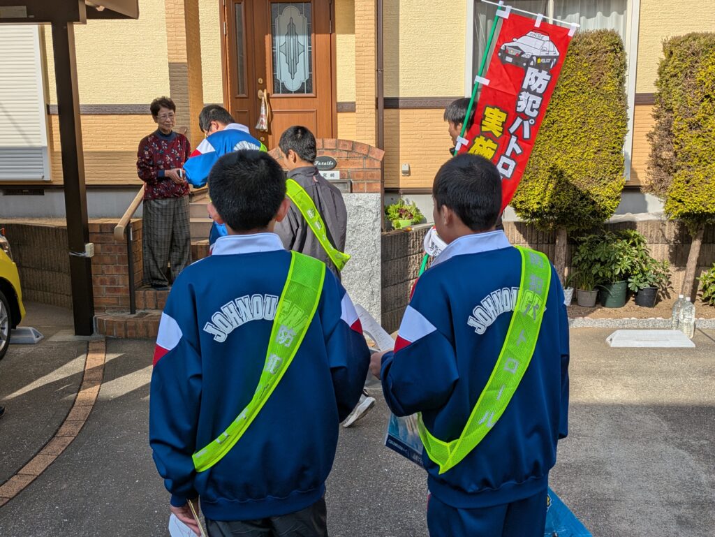 秋晴れの下、城ノ内中学校から7名のご協力をいただき、八原地区松ヶ丘1区の防犯キャンペーンを行いました。はじめに八原まちづくり協議会防犯委員会より呼びかけの手順を伝え、2班に分かれて、各家庭を訪問し防犯チラシを渡して防犯の大切さを呼びかけ、防犯グッツを配ってもらいました。訪問先では多くのご家庭で歓迎していただき、楽しく防犯キャンペーンを行うことができました。 城ノ内中の皆さん、ご協力、ありがとうございました。