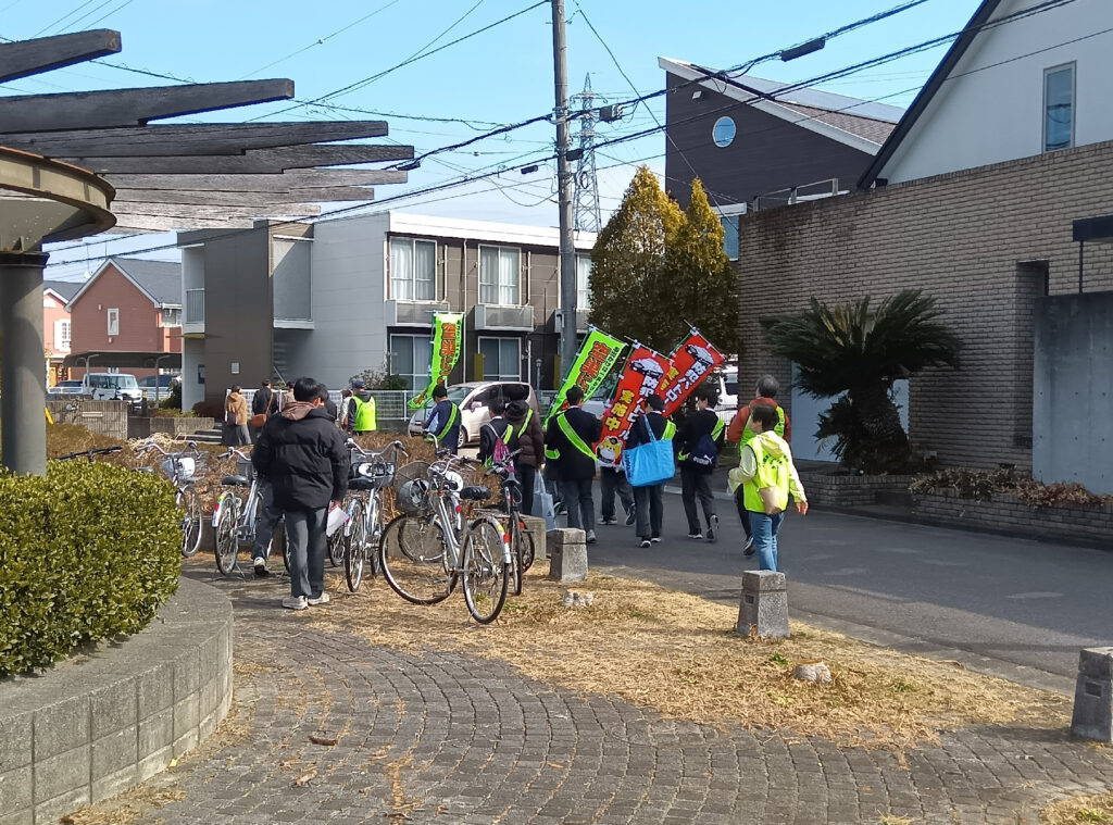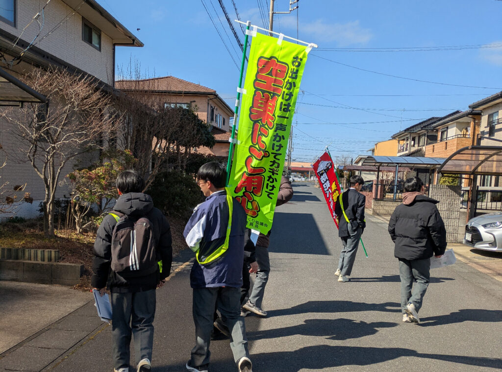 2月21日、晴天の土曜朝に、松ヶ丘2街区公園に集合して、城ノ内中学校男子バスケットボール部の顧問の先生、10名の生徒さんに協力いただき、防犯キャンペーンを行いました。